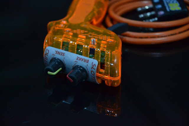 Refiro-me ao fabuloso punho de que dispus. Sempre me confrontei com punhos de extrema falta de fiabilidade e altos custos e dos quais não conseguia nunca retirar deles o melhor de que precisava. Mas afinal, a Sloting Plus dispõe no mercado de um dos mais extraordinários punhos, podendo eu dele colher agora vários benefícios. De aspecto demasiado "simplório", poderá por essa razão merecer da nossa parte alguma imediata rejeição. Mas desenganem-se, dado tratar-se de facto de algo que de tão simples, tem a capacidade de nos surpreender em absoluto. Poderei começar pela sua leveza. Sem grandes ""aparelhagens" nele montadas e dotado de um chassis onde se encontra a totalidade dos circuitos integrados e em que o gatilho funciona por leitura óptica, o seu peso e simplicidade deixam-no imediatamente em vantagem perante a concorrência. Um fio comprido de origem, permite-me a mim, um concorrente conhecido pelos meus "bailados em palco", não dar grandes esticões como muitas vezes me via a acontecer, com as naturais desastrosas consequências que daí poderão advir. As afinações, quase todas elas perfeitamente intuitivas, simplificam imediatamente a sempre desagradável tarefa de se conseguir a afinação perfeita para cada tipo de pilotagem. E para regulação em prova, ficam ao nosso alcance apenas dois reóstatos. O do travão e o da sensibilidade (controlo de tracção).