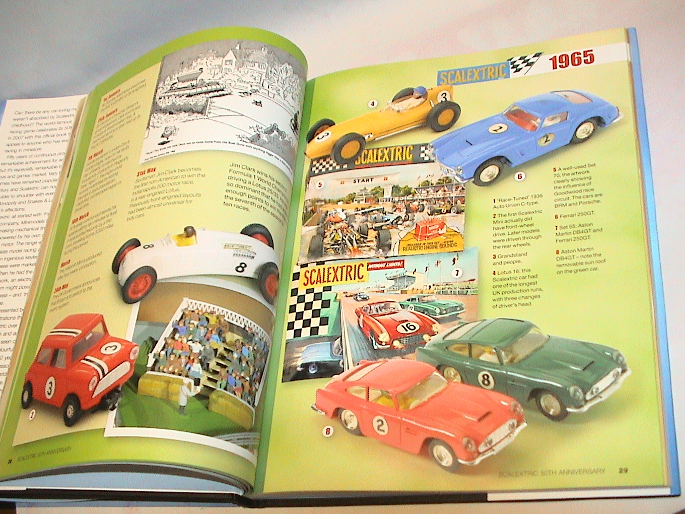 Históricamente, os antepassados destes dois magníficos eram os Scalex e tratavam-se de modelos de chapa de dar à corda, cuja escala variava entre 1/32 para os modelos saloon e 1/28 para os desportivos, mas que aqui não abordarei por se desenquadrarem do tema que me apraz aqui desenvolver. A empresa Triang, detentora à época dos direitos destes brinquedos, acabaria em 1957 por apostar pela primeira vez na adaptação de motores eléctricos a estes modelos de qualidade espartana em que o conceito da corda lhes começava já a parecer merecedora de uma revolucionária evolução. Esta variante de modelos de chapa electrificados perduraria até 1960, ano da reinvenção deste conceito de sucesso, com a substituição da chapa, pelo plástico. Mas da associação destes reinventados "bólides" dotados agora de locomoção própria através do seu uso em apropriadas pistas alimentadas por corrente eléctrica e que nasceriam com o propósito único de servir uma nova modalidade de entretenimento para crianças, surgiria a palavra que perdura até hoje, Scalextric, criada a partir da junção da inicial marca "Scalex", com "eléctric", o revolucionário conceito em que agora se apoiariam. Mas os donos da empresa perceberam que estes novos brinquedos mereciam um sério e renovado estudo acerca do seu original conceito. Afinal, tinham inventado a "pólvora" e era agora necessário dar-lhe uma nova alma. E a revolução aconteceria com a adopção dos plásticos injectados, o que permitia a criação de réplicas muito melhoradas das reproduções pretendidas. Aliado a isso, se o conceito em si das pistas se manteve praticamente inalterado, uma das outras revolucionárias evoluções aconteceria na recriação da transferência da corrente eléctrica da pista, para os mini-modelos. Não se chamavam ainda patilhões, achando-se à palavra "guia" o mais apropriado e ainda hoje também assim chamado por alguns aficionados, mas o conceito dos mesmos era ineficaz e havia necessidade duma recriação daquele órgão de forma a que houvesse uma significativa melhoria na eficiência do conjunto.