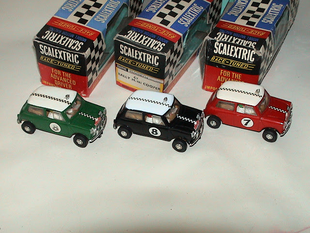 Históricamente, os antepassados destes dois magníficos eram os Scalex e tratavam-se de modelos de chapa de dar à corda, cuja escala variava entre 1/32 para os modelos saloon e 1/28 para os desportivos, mas que aqui não abordarei por se desenquadrarem do tema que me apraz aqui desenvolver. A empresa Triang, detentora à época dos direitos destes brinquedos, acabaria em 1957 por apostar pela primeira vez na adaptação de motores eléctricos a estes modelos de qualidade espartana em que o conceito da corda lhes começava já a parecer merecedora de uma revolucionária evolução. Esta variante de modelos de chapa electrificados perduraria até 1960, ano da reinvenção deste conceito de sucesso, com a substituição da chapa, pelo plástico. Mas da associação destes reinventados "bólides" dotados agora de locomoção própria através do seu uso em apropriadas pistas alimentadas por corrente eléctrica e que nasceriam com o propósito único de servir uma nova modalidade de entretenimento para crianças, surgiria a palavra que perdura até hoje, Scalextric, criada a partir da junção da inicial marca "Scalex", com "eléctric", o revolucionário conceito em que agora se apoiariam. Mas os donos da empresa perceberam que estes novos brinquedos mereciam um sério e renovado estudo acerca do seu original conceito. Afinal, tinham inventado a "pólvora" e era agora necessário dar-lhe uma nova alma. E a revolução aconteceria com a adopção dos plásticos injectados, o que permitia a criação de réplicas muito melhoradas das reproduções pretendidas. Aliado a isso, se o conceito em si das pistas se manteve praticamente inalterado, uma das outras revolucionárias evoluções aconteceria na recriação da transferência da corrente eléctrica da pista, para os mini-modelos. Não se chamavam ainda patilhões, achando-se à palavra "guia" o mais apropriado e ainda hoje também assim chamado por alguns aficionados, mas o conceito dos mesmos era ineficaz e havia necessidade duma recriação daquele órgão de forma a que houvesse uma significativa melhoria na eficiência do conjunto.