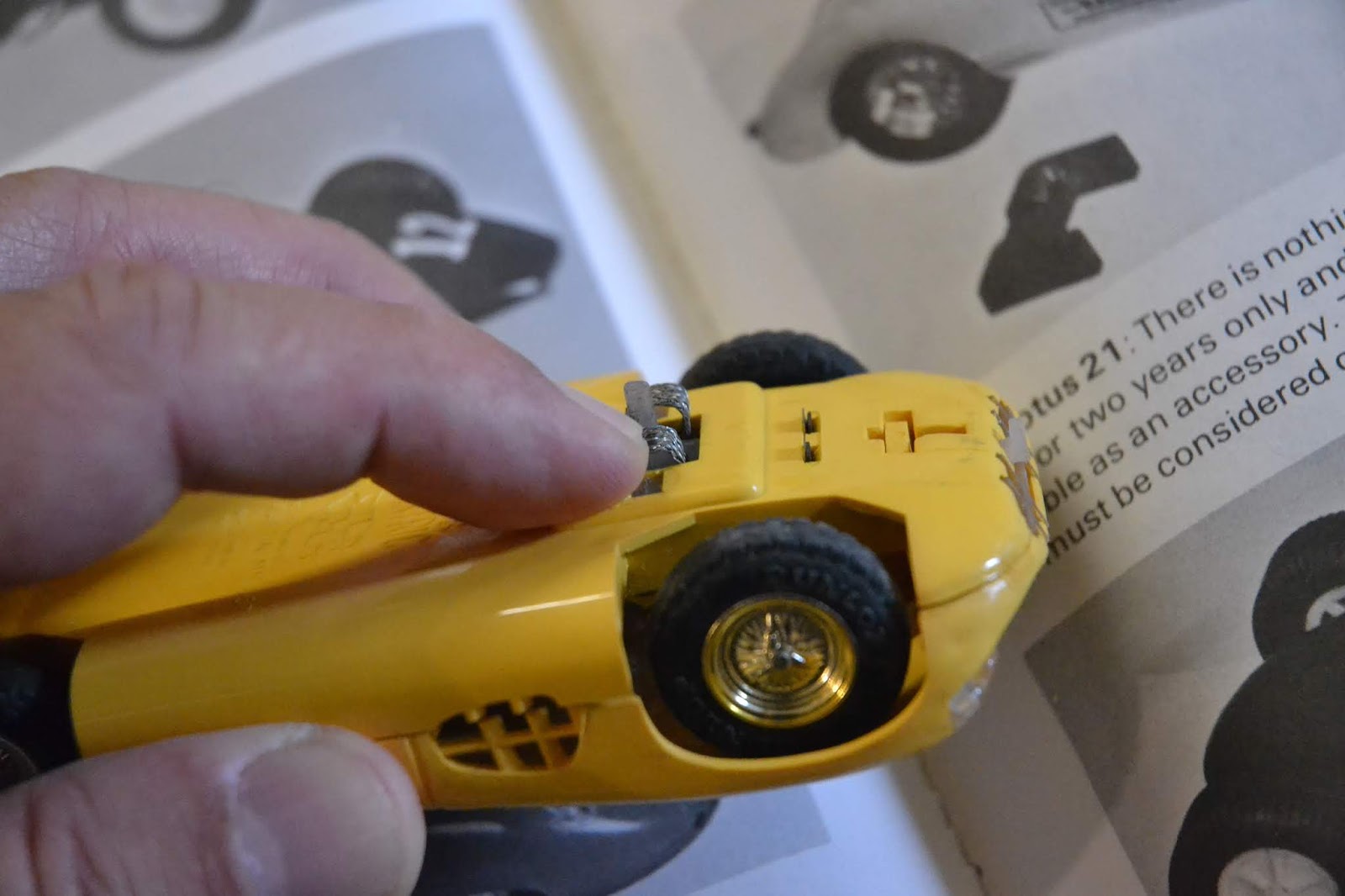 As imagens inferiores que se seguem, com a interposição da imagem de um dos modelos em lata já electrificados, mostram como a montagem das palhetas poderia ter influência , já que quanto mais salientes do chassis, menos espigão a servir de guia existiria. E a forma como eram montadas, permitiam flexibilidade suficiente para funcionarem como mola. Daí, a Scalextric ter-se sentido na necessidade de corrigir o conceito, banindo esta guia com a referência G2 para dar lugar ao conceito com a refência G3. A letra "G" designa "guide" em inglês, com a tradução de "guia" para português, representando o numeral a sequência do desenvolvimento. E assim, à referência G1 corresponde a guia dos modelos ainda em lata e afinal, bem distinto do agora mostrado, mas que por curiosidade aqui se deixa para observação na imagem inferior. Tratavam-se de duas campainhas unidas por um material isolante e em que em cada uma delas se fazia passar a corrente positiva e a negativa, até ao motor cujo eixo de tracção fazia parte de um bloco só com o motor.