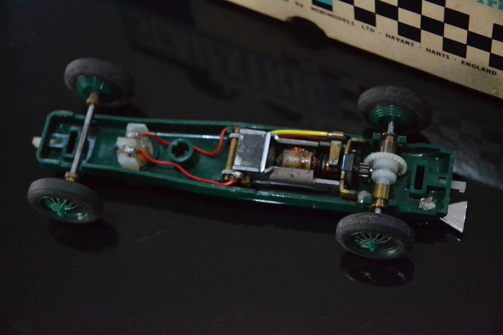 Este por sua vez foi montado em posição invertida, proporcionando a estes belos Mini que tivesse tracção frontal. O eixo traseiro de encaixe apenas central, acaba por ter movimentos livres, facilitando o desempenho do mini-modelo. Contudo, este sistema não se mostrou suficientemente eficaz para ser mantido, não tendo passado de uma interessante experiência. A imagem inferior mostra-nos como o eixo de tracção se encontra integrado no próprio motor.