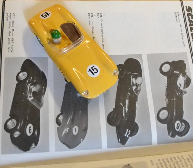 Na imagem que acima se mostra, constam os quatro primeiros modelos editados pela Scalextric em plástico e recorriam a um primeiro conceito de guia nascido em Dezembro de 1961, uma peça independente do chassis, mas fixa no mesmo. Um simples espigão era o suficiente para servir de guia do modelo ao percorrer a calha da pista, mas este arcaico conceito tinha de contar com uma boa montagem das palhetas, que por sua vez funcionavam de mola, mas que por essa razão implicavam negativamente na eficiência do sistema.